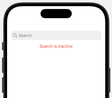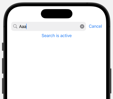 検索フィールドをタップなどによりアクティブにすると、isSearchingtrueになり、“Search is active”が表示されます。