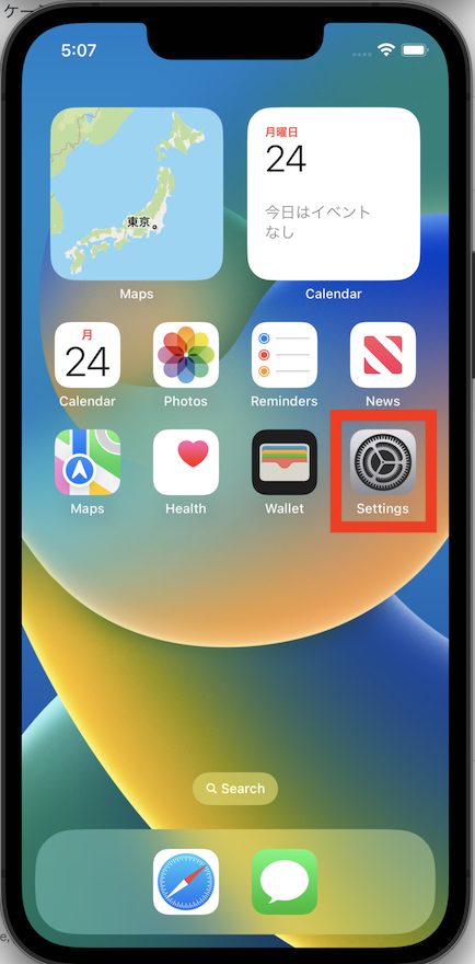1.シミューレーターのホーム画面で「Settings」をタップします。
