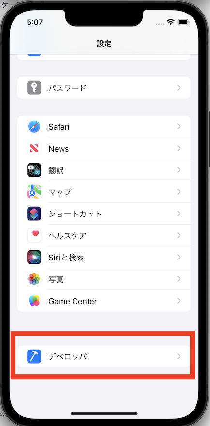 2.Settings画面を下にスクロールしていくと、「デベロッパ」の項目があるため、タップします