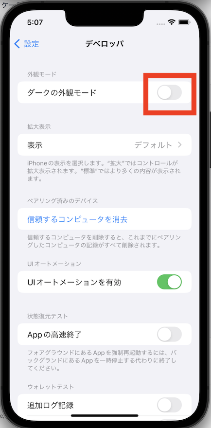 3.「ダークの外観モード」というスイッチがあるため切り替えると、シミュレーターがダークモードとなります