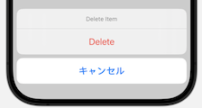 “Delete”ボタンには.destructiveロールが適用され、赤いテキストで表示され、取り返しがつかないアクションなどを表します。一方、“Cancel”ボタンは自動的に作成されます。なお、キャンセルボタンの表示を変えることももちろん可能です。