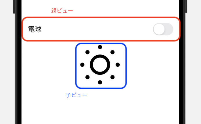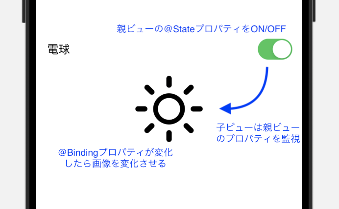 ポイントは子ビューで@Bindingプロパティであるlightbulに親ビューのisLightbulbを紐づけています。