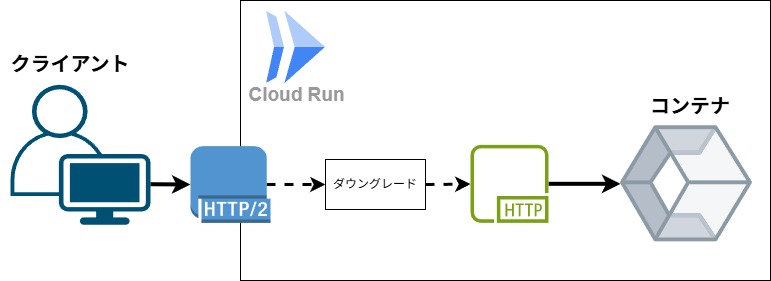 Cloud Runにおいてデフォルトの動作では、HTTP/2リクエストをコンテナに送信する際に、HTTP/1にダウングレードしています。