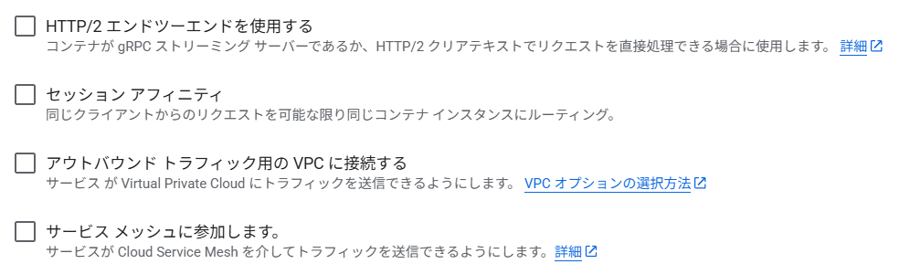 現在のCloud Runのネットワーキング設定には、主に以下の4つのチェックボックスがあります。
