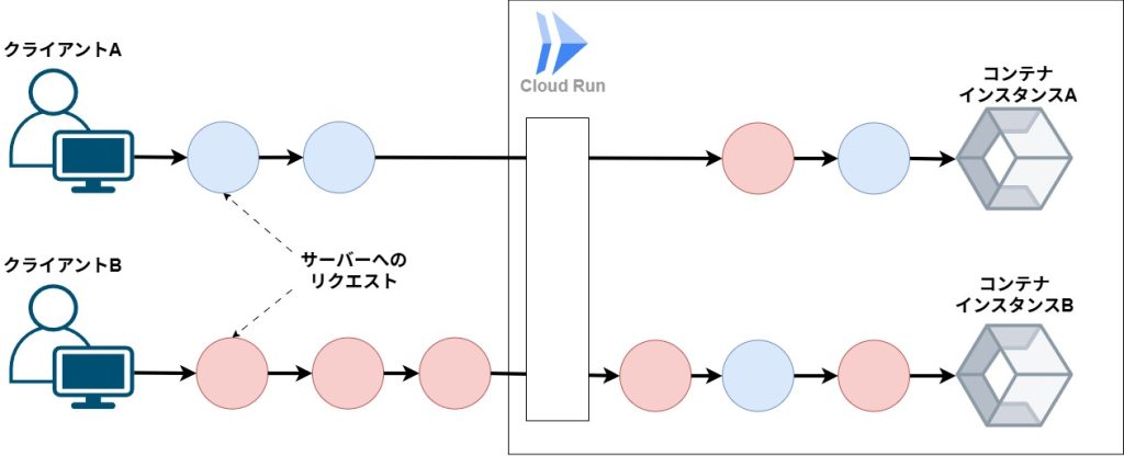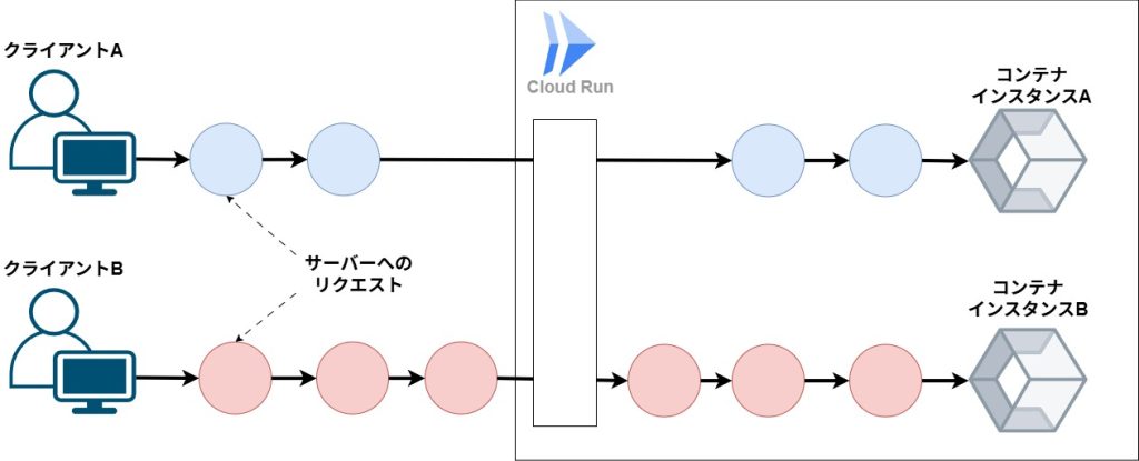 • デフォルトでは、Cloud Runはセッションアフィニティをサポートしません。つまり、同じクライアントからの次のリクエストが、別のコンテナインスタンスにルーティングされる可能性があります(ロードバランシングの原則)