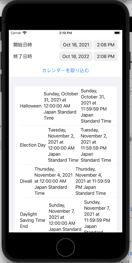- ボタンを押すとユーザーが指定した日時のイベントをリストにして表示