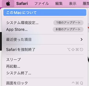 - 画面左上のアップルのメニューをクリックし、「このMacについて」を選択します。