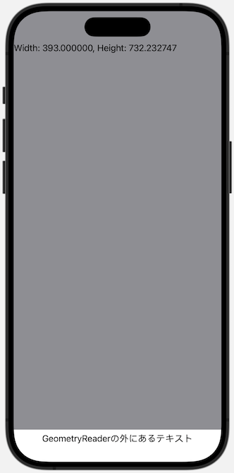 さらに、GeometryReaderの外にあるもう一つのTextビューは、GeometryReaderの外側に配置されています。これにより、GeometryReader内のビューと外部のビューを組み合わせて表示されることが確認できます。