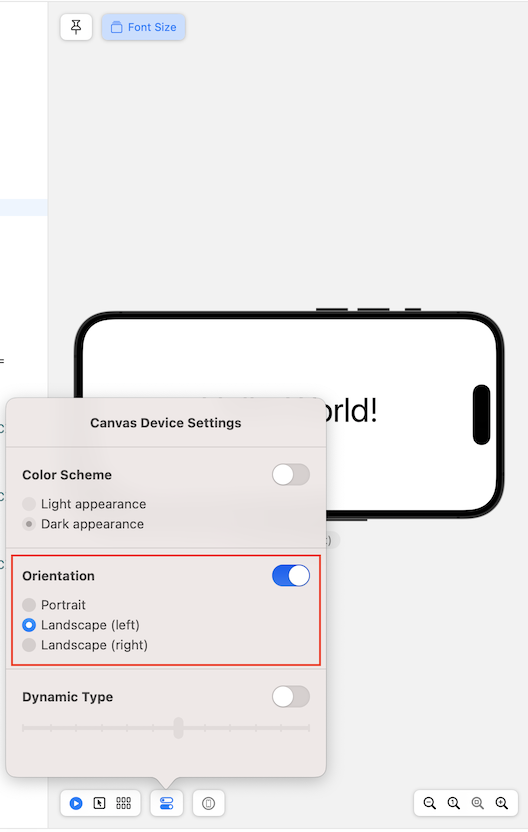 【XCode】SwiftUIにおけるプレビューの回転方法 SwiftUI 2023.08.19 この記事は約1分で読めます。 SwiftUIを使用する際のCanvas上でプレビューを回転する方法を紹介します。 目次 手順1.プレビュー画面の下側にスイッチのようなボタンがあります。選択すると『Canvas Device Setting』というメニューが開きます。2.「Orientation」のトグルを有効にして、Landscapeを選択するとプレビューを回転させることができます。 手順 1.プレビュー画面の下側にスイッチのようなボタンがあります。選択すると『Canvas Device Setting』というメニューが開きます。 2.「Orientation」のトグルを有効にして、Landscapeを選択するとプレビューを回転させることができます。