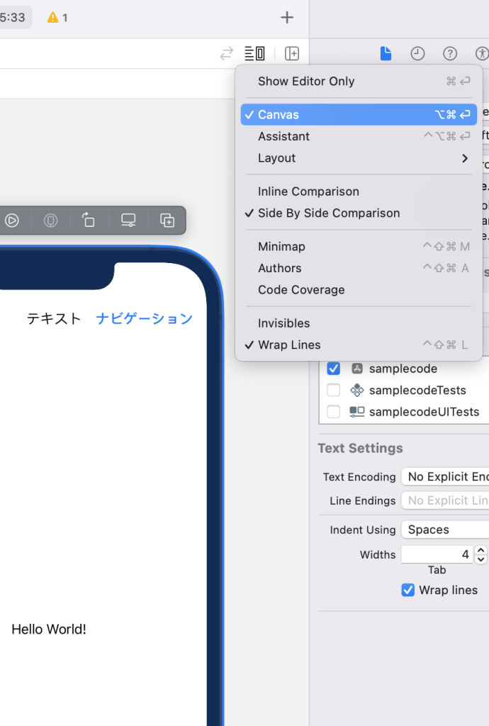 【XCode】プレビュー画面が表示されなくなった iOS 2022.08.18 この記事は約1分で読めます。 Xcodeを使用していてプレビュー画面を誤って消してしまい元に戻せなくなった場合の対処法です。 画面右上の赤枠部分のボタンを押すと、メニューが表示されます。メニュー内の「Canvas」をチェックするとプレビュー画面が表示されます。