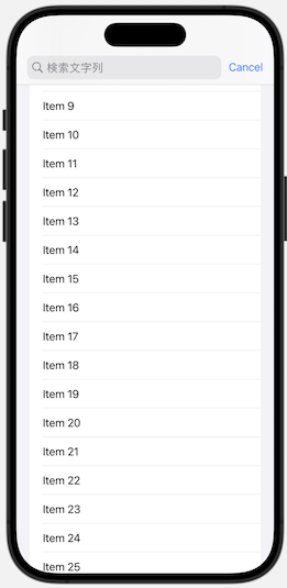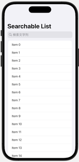 .searchable(text: $searchText, placement:.toolbar, prompt: "検索文字列")