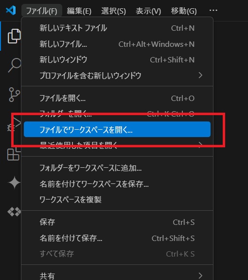 ファイル→ワークスペースとして保存を選択し、拡張子.code-workspaceのファイルを作成します。